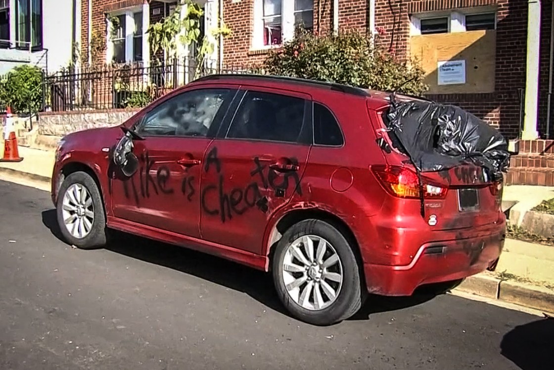 Someone was apparently really upset that Mike cheated on them. So upset, that they didn’t bother to check if the vehicle they vandalized to get back at Mike had any actual connection to Mike.